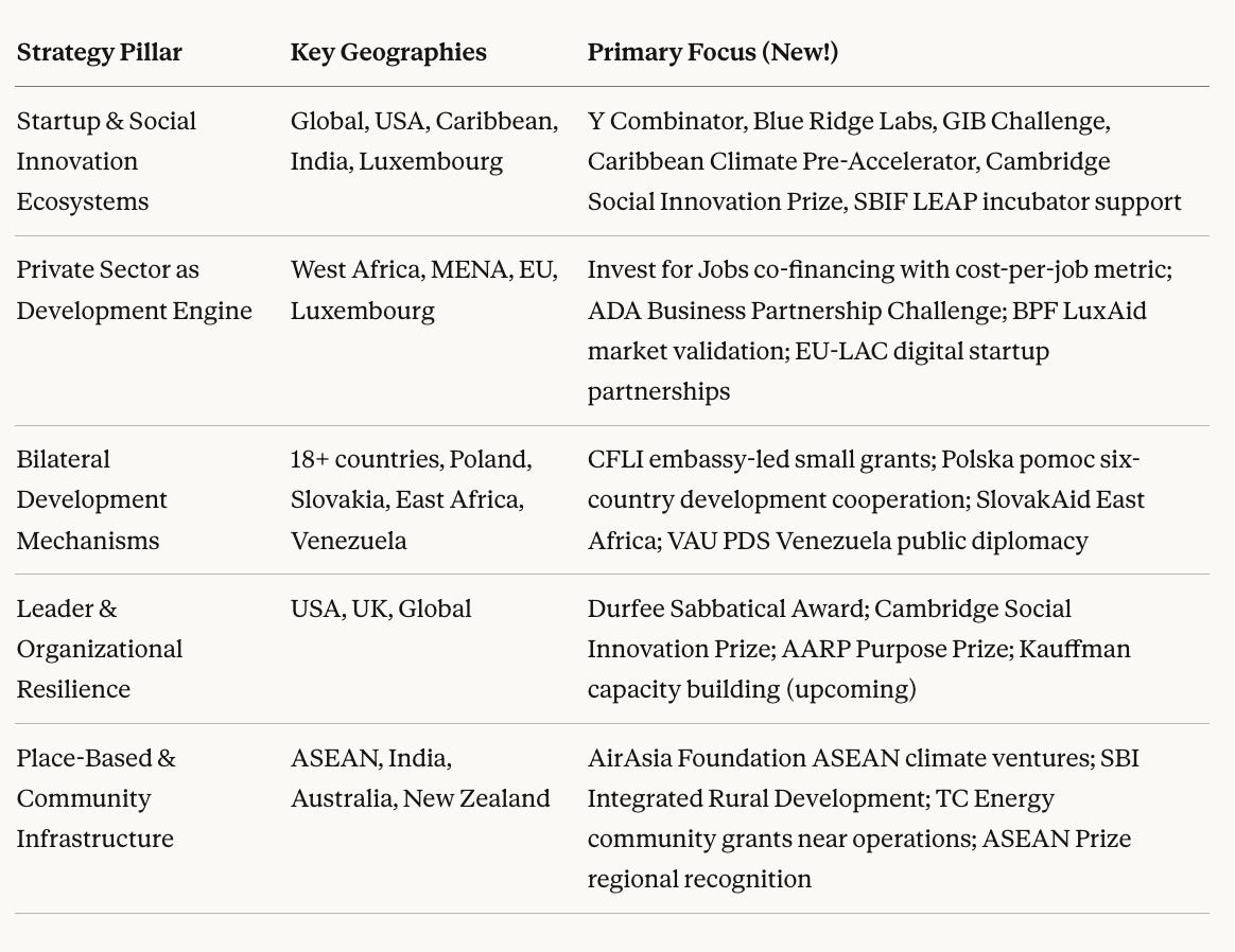 For practitioners in the startup and social innovation space, this month’s density means increased competition but also multiple entry points for the same venture — different funders, different stages, different geographies. The most efficient strategy is clarity on which stage you’re actually at and which funder’s selection logic matches. For organizations working across ODA-eligible geographies, the private sector co-financing calls (ADA, BPF, Invest for Jobs) reward partnerships with real commercial logic — proposals that lead with impact but can’t show commercial viability will struggle. For bilateral grant practitioners, speed is the primary competitive variable this month: embassy-led selection moves fast, often to known actors, and deadline clusters mean multiple mission deadlines fall within days of each other. For executive leaders of nonprofits, the Durfee call is genuinely unusual — it’s worth reading carefully if you’re running an LA County organization and have been considering what leadership succession actually requires.