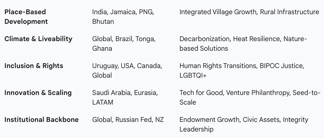 This month, the data highlights a powerful momentum behind “Liveability” and Financial Autonomy. Through high-stakes challenges like Temasek’s Liveability Challenge and the Vladimir Potanin Foundation’s focus on endowments, the focus is shifting toward solving the “double-transition” of urban greening and long-term financial independence for the non-profit sector. This month’s landscape reflects a shift toward “Place-Based Success,” where success is measured by how deeply an intervention takes root in a community’s legal and physical infrastructure.